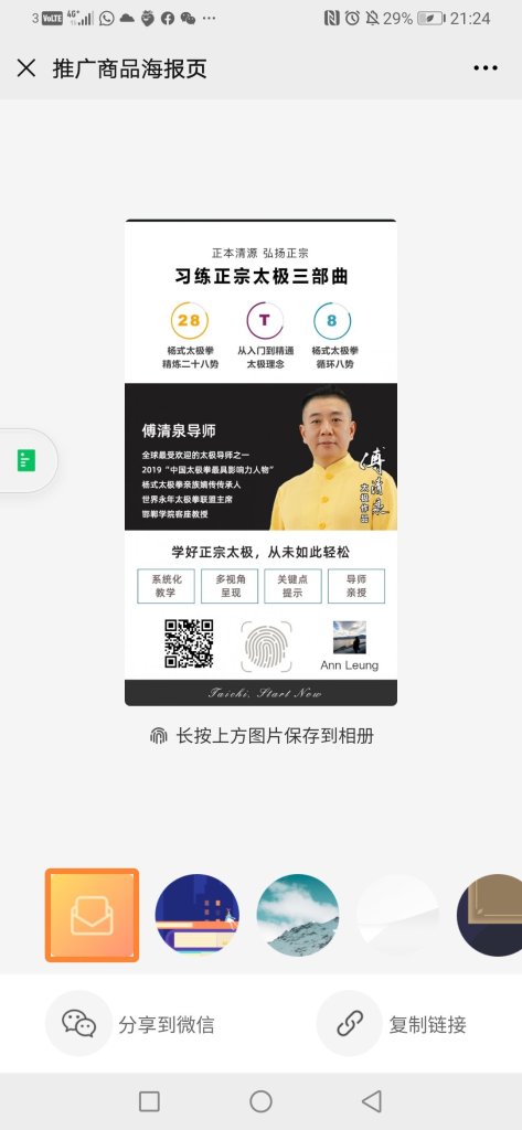 September 22, 2020September 22, 2020 Ann 全球最受欢迎的太极导师之一傅清泉导师全新的太极作品,丰盛呈现 首次系统化的线上教学多维视角、关键点提示极为细致的教学9月25日起,正式优惠预售让太极成为全球人的一种生活方式 此課程適合新舊學員。9月25日預售,记得是 9月25日早上10:00预售(首三百名報名會有優惠價),目前产品未上架 ,到时候会上架。V28,三个内容,51节课,有效期限一年。三个项目:杨28,循环八势,入门理念。非常清晰的教学,我推介。**請長按儲存圖片並掃描二为码登入便可,需用微信支付。查詢可與我联系:93092397 Share this: Share on Facebook (Opens in new window) Facebook Share on WhatsApp (Opens in new window) WhatsApp Like Loading...